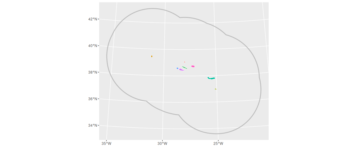 Although those functions offer the most accurate projection, they can’t be combined into one single sf object, as this requires the same CRS for all features. Alternatively, we also offer a default LAEA projection centered on the Azores which allow all islands data in one single sf object. For these data, use these functions: