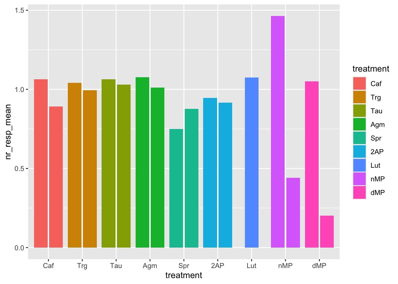 ggplot(fig06_averages, aes(x = treatment, y = nr_resp_mean, fill = treatment)) +